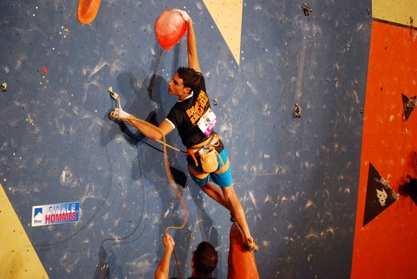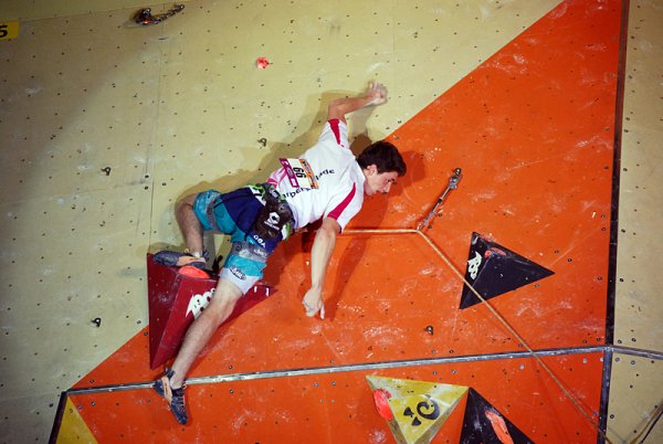 Chez les hommes, une voie atypique et très intense ne laissera que peu de chances aux 8 finalistes. Le détail ? Une structure posée au sol permettait de prendre pied sur la voie. Les choses sérieuses commençaient tout de suite avec un cheminement compliqué entre deux gros volumes, suivi d'une tranche très soutenue physiquement. La suite de la voie embarquait les grimpeurs dans une traversée déversante. C'est ici que la plupart des finalistes commettent leur faute : ils ne sont que 4 à en sortir indemne.